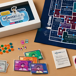 Gioca nei panni di un imprenditore nella [mala]sanità. Acquista reparti e investi per renderli più redditizi! Acquista, investi e gestisci ospedali, personale e reparti in un sistema in cui la salute ha un prezzo e l'etica è facoltativa. Se investi troppo, il tuo personale crollerà. Se giochi troppo sul sicuro, il tuo impero crollerà. Solo chi sa bilanciare cinismo, fortuna e strategia sopravvive. Perché nella sanità privata... chi non può permettersi il ricovero ospedaliero non fa una bella fine. COMPONENTI: • 1 Tabellone di gioco (Mappa stampata su stoffa) • 6 Pedine con marcatori di proprietà • 2 Dadi • 6 Indicatori di benessere dello staff (da +8 a -15) • Banconote da 10, 20, 50, 100 e 500 € • Carte "Evento" • Istruzioni Ogni scatola è assemblata a mano da noi con materiali resistenti, così potrete continuare a giocare (e ridere) anche tra dieci anni. Speriamo, in un sistema sanitario migliore. PERCHÉ È IMPORTANTE: L'assistenza sanitaria dovrebbe curare, non arricchire. Attraverso l'ironia, INSANITÀ S.p.A. invita i giocatori a riflettere, a ridere, su quanto siamo andati lontano da quell'idea. È divertente finché non lo è più. Ed è proprio questo il punto. Ideazione: Andrea D’Accurso. Meccanica di gioco: Andrea D’Accurso ed Enrico [Ciuffo]. Grafica: Enrico [Ciuffo] @ciuffoelifermieristica. Illustrazioni: Francesco Smeragliuolo @smerabbasta @finn_nasoblu.